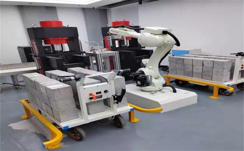 機(jī)器人全自動(dòng)混凝土壓力試驗(yàn)機(jī)可連續(xù)完成混凝土的抗壓強(qiáng)度試驗(yàn)。該試驗(yàn)機(jī)主要由微機(jī)控制油電混合伺服壓力試驗(yàn)機(jī)、六自由度機(jī)械手、氣抓、視覺系統(tǒng)、液壓伺服系統(tǒng)等組成。整個(gè)試驗(yàn)過程無需人員參與,可自動(dòng)完成抓樣、試樣信息自動(dòng)掃碼識(shí)別、試樣自動(dòng)找正、自動(dòng)上下料以及試驗(yàn)結(jié)束后對(duì)合格與不合格試樣的分類堆放等過程,實(shí)現(xiàn)了試驗(yàn)機(jī)智能化與自動(dòng)化,極大的提高了工作效率。